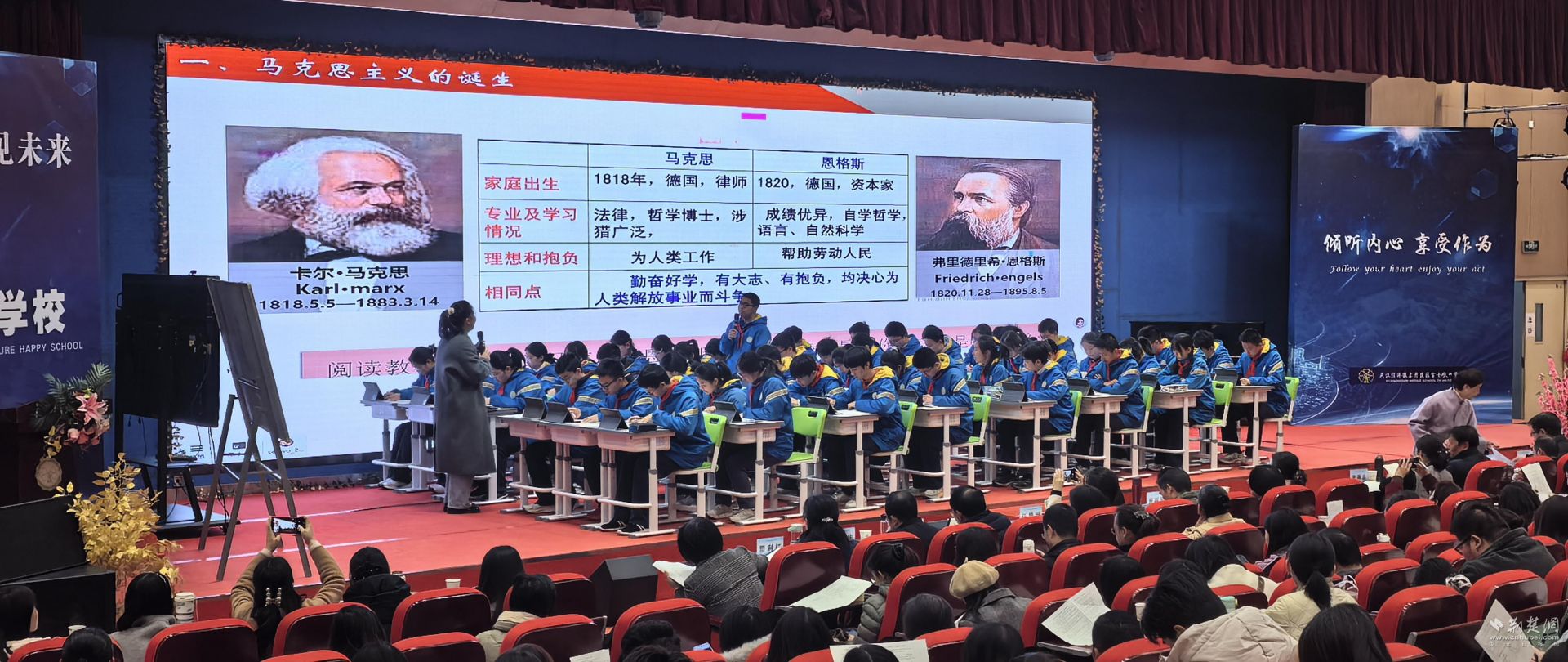 活动以九年级的历史课开始,题为“马克思主义的诞生和国际共产主义运动的兴起”。观世墩中学的教学老师桂小贝以“真理的味道”为线索,组织学生进行情景叙述和史料探索。在课堂上,中小学智能平台和AI分析工具的运用较多。学生通过平台进行课前调查,课堂上利用AI工具进行相互分析。技术方法与学习目标密切相关。
